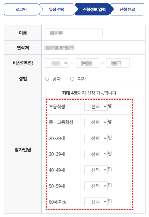 4. 예약창에서는 신청인의 정보와 참가인원을 선택해 주세요.