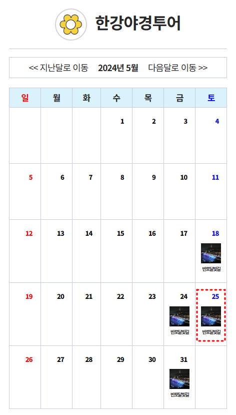 2. 참여하고자 하는 일정을 한강야경투어 달력에서 선택
