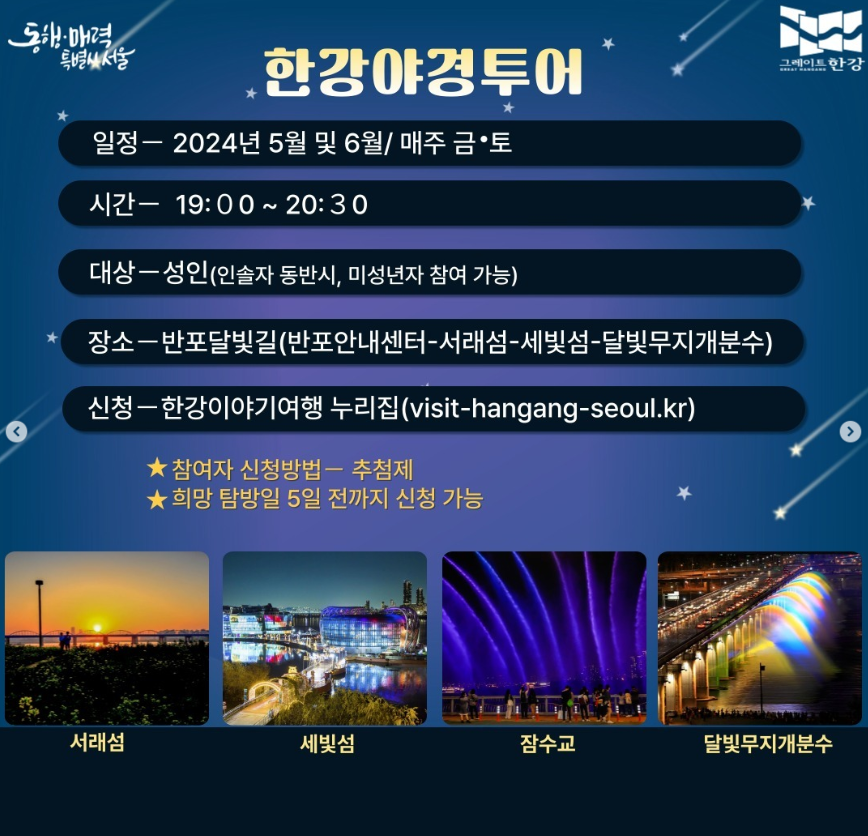- 한강야경투어 일정 : 5월 10일 ~ 6월 29일 (매주 금, 토)