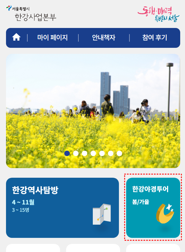 1. 한강야경투에 신청페이지 접속 후 메인페이지 '한강야경투어 봄/가을' 배너 선택