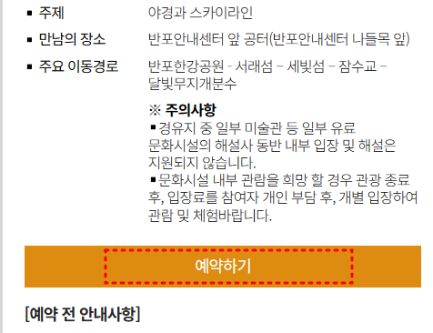 3. 반포달빛길의 주제와 만남의 장소, 이동경로 등 주의사항 등을 제대로 확인한 뒤 하단의 '예약하기' 버튼을 눌러주세요.