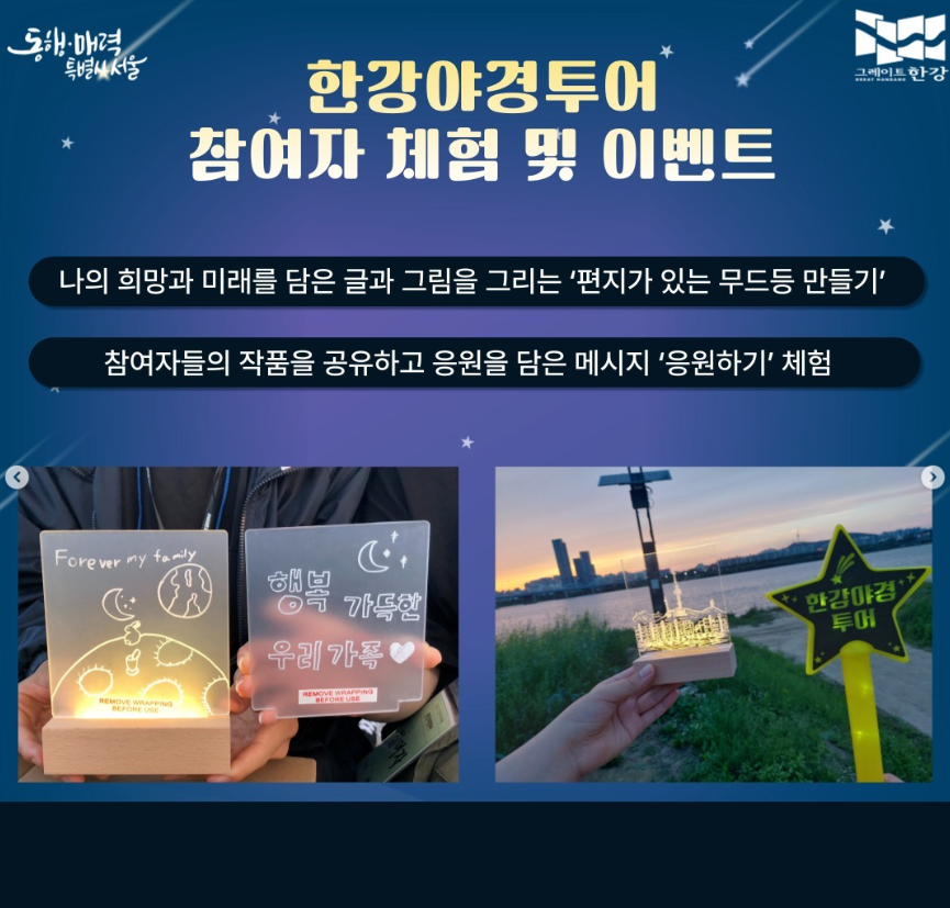 지금까지 한강야경투어 신청방법과 투어일정에 대해서 알아봤습니다. 5월 10일부터 6월 29일까지 한시적으로 진행되는 한강야경투어는 도보로 걸으면서 아름다운 야경도 즐기면서 한강의 숨어있는 역사를 알아볼 수 있는 기회가 됩니다. 또한, 아크릴 무드등으로 꾸미는 편지가 있는 무드등 만들기 체험도 운영하고 있으니 가족이나 연인들에게 더욱 특별한 추억이 될 것으로 보입니다.
