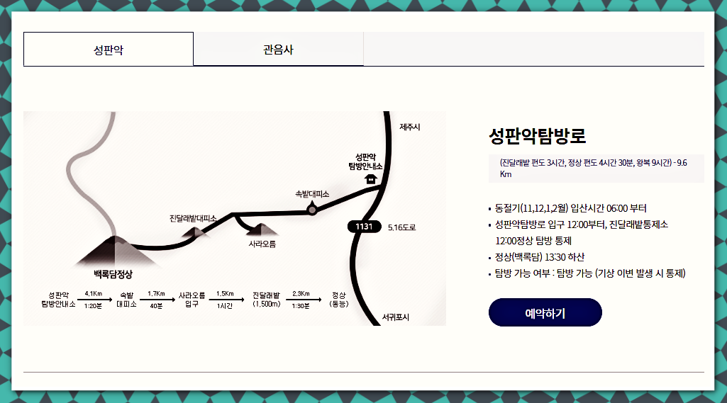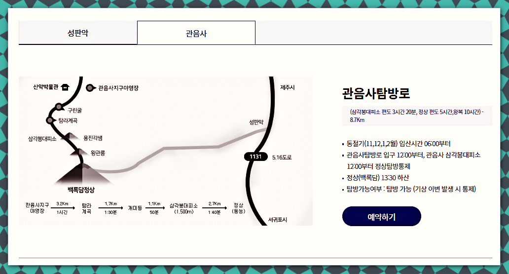 한라산 탐방로예약 시스템을 통해 예약해야만 이용할 수 있는 탐방로는 '성판악 탐방로'와 '관음사 탐방로' 입니다. 이 두 코스는 예약없이는 탐방할 수 없기때문에 방문 전 꼭 반드시 예약을 해야합니다.