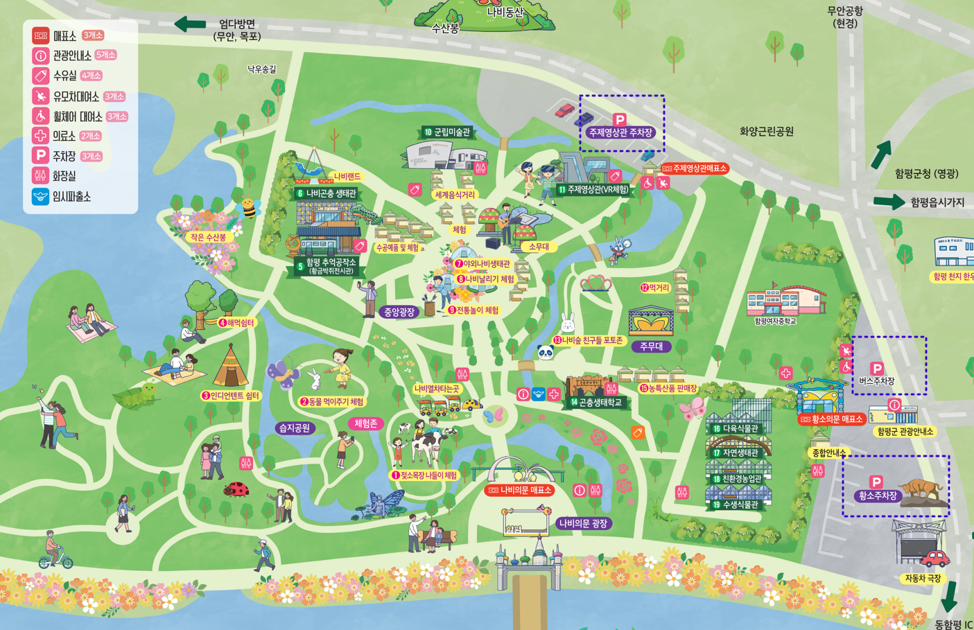 함평 나비축제는 많은 사람들이 방문하는 곳으로 주차가 번거로울 수 있는데요, 방문 전 행사장 안내도에 표시되어 있는 주차장 위치를 미리 파악하신다면 불편을 덜 수 있습니다.