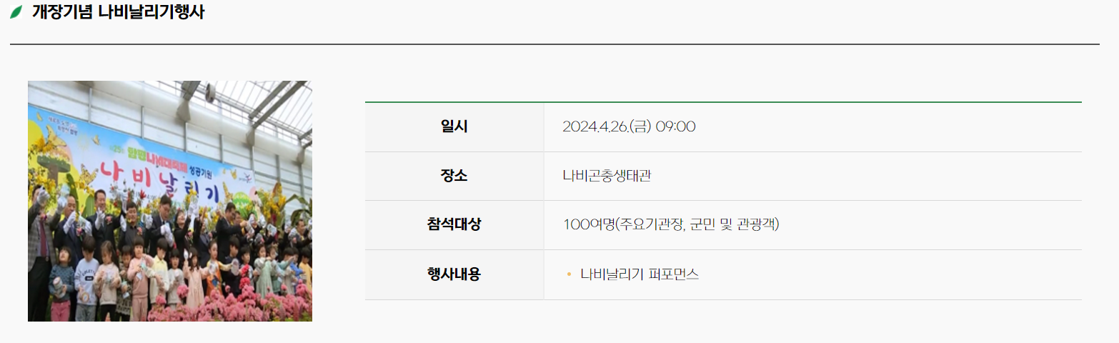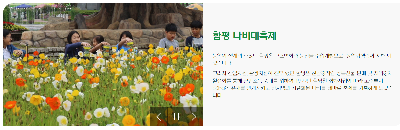 함평 나비축제는 매년 봄 함평 엑스포공원에서 열리는데요, 다양한 종류의 나비를 관찰하고 아름다운 자연과 맛있는 먹거리가 풍부한 축제입니다.