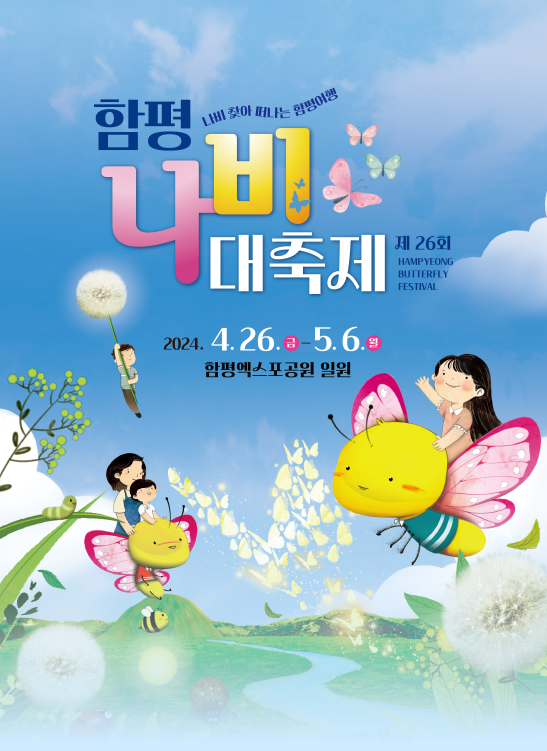 올해 4월에도 함평 엑스초 공원 일원에서 제26회 함평나비대축제가 열립니다. 4월 26일부터 5월 6일까지 11일간 열리는 함평 나비축제는 아름다운 꽃과 나비를 주제로 한 다양한 전시와 함평군의 농특산물을 전시하고 판매하고 있으니 꼭 한번 방문해 보세요.
