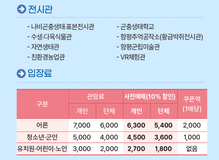 단체관람권은 방문인원이 20명인 경우 혜택을 받을 수 있습니다. 무료입장은 국가유공자, 만 4세 이하 영유아, 보호자 포함 중증장애인, 경증장애인, 함평군민인 경우 혜택을 받을 수 있습니다.
