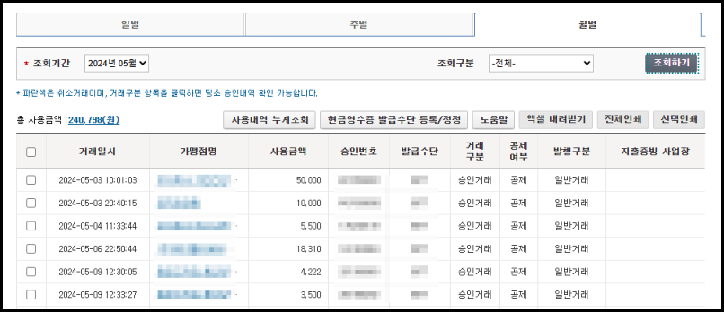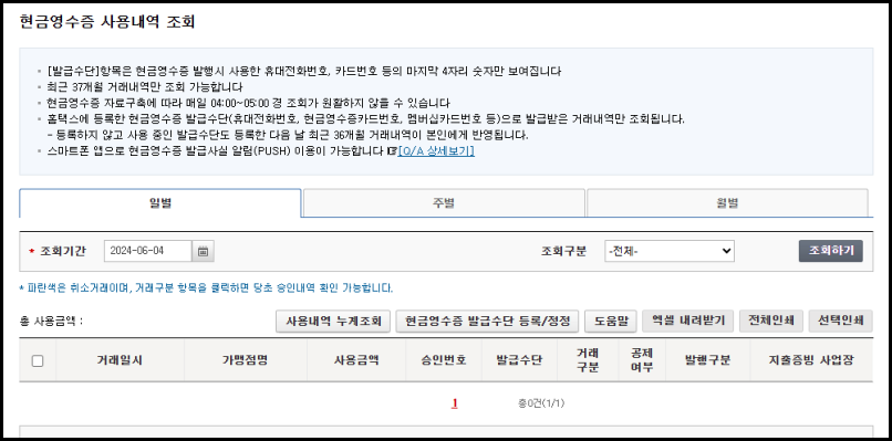 현금영수증 사용내역 조회 페이지는 일별, 주별, 월별로 기간별로 조회가 가능합니다. 기간을 선택하고 조회하기를 누르면 설정한 기간 동안 발급받은 모든 현금영수증 내역을 확인할 수 있습니다.