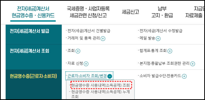 로그인 후, 상단 메뉴에서 '전자세금계산서/현금영수증/신용카드' > 현금영수증(근로자/소비자) > 근로자/소비자 조회/변경> 현금영수증 사용내역 조회' 선택.