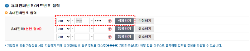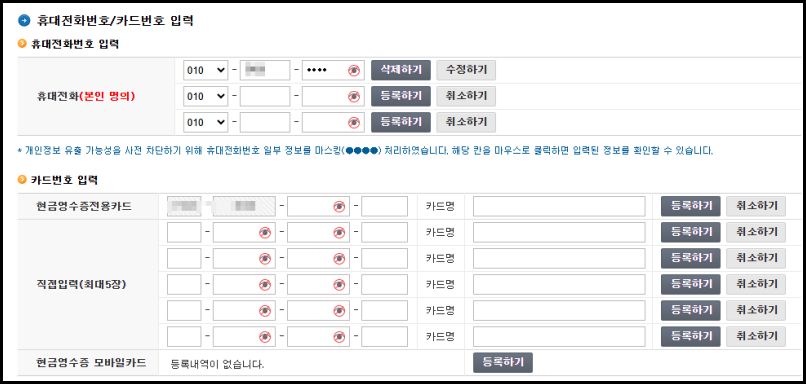현금영수증 홈페이지에 발급수단이 정상적으로 등록이 완료되면, 등록페이지에 핸드폰번호나 카드번호가 조회되며, 등록하기 버튼이 아닌 '삭제하기'버튼으로 변경된 것을 확인할 수 있습니다.