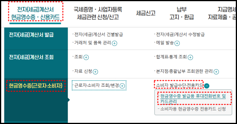 로그인 후, 상단 메뉴에서 '전자세금계산서/현금영수증/신용카드' 클릭, '현금영수증 (근로자, 소비자)' 메뉴에서 '소비자 발급수단 전용카드' 하단의 '현금영수증 발급용 휴대전화 번호 및 카드관리' 메뉴를 선택합니다.