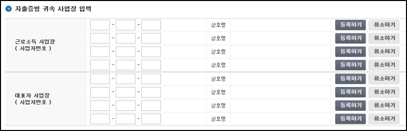 만약 지출증빙용 현금영수증을 등록하고 싶다면, 하단에서 지출증빙 귀속 사업장의 사업자 번호와 상호명을 입력한 후 '등록하기' 버튼을 클릭하면 됩니다.