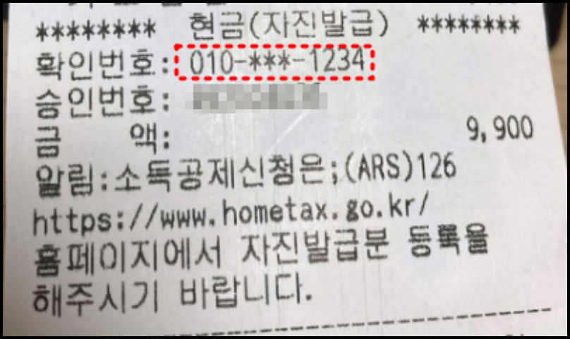 발급시 받는 영수증 상에서도 식별번호가 일부만 표시되어 전체적으로 확인해 볼 수 없어 정상적으로 발급되었는지 곧바로 확인이 어렵습니다. 발급 여부를 별도로 꼭 조회해 주는 것이 좋습니다.