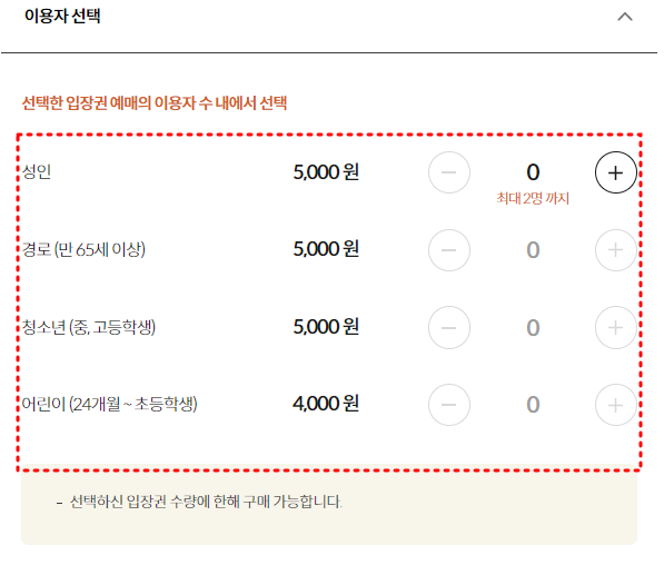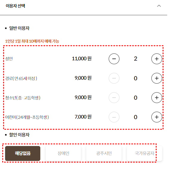 예약페이지에서는 이용일과 이용시간, 이용자 선택을 진행 후 할인대상자가 있는 경우 할인대상을 선택.