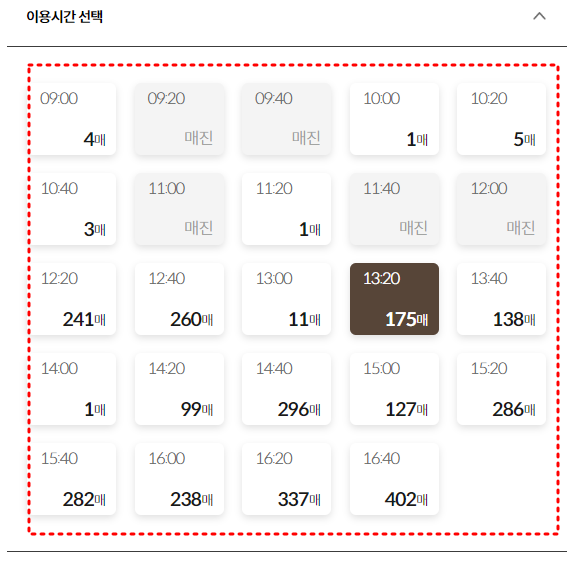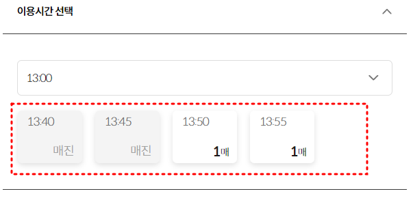 예를 들어 13시 20분 입장권을 선택했다면, 모노레일은 13시 40분 이후부터 예매할 수 있습니다.