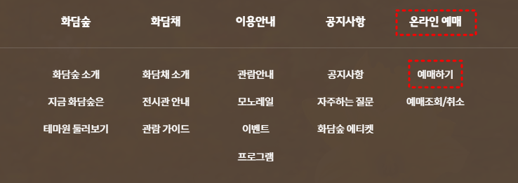 화담숲 홈페이지 접속 후 > 상단메뉴 '온라인 예매' > 예약하기 선택