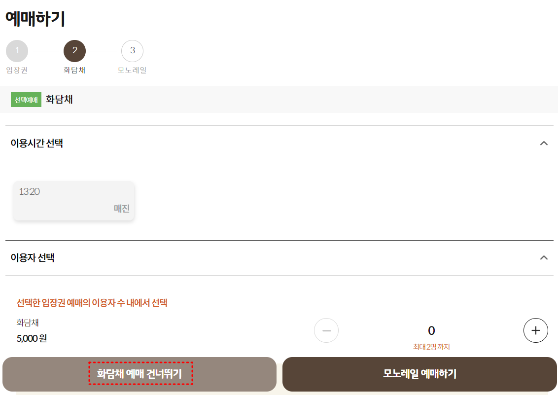모노레일 예약을 위해서는 입장권 선택 후 하단에 '화담채 예매'를 선택해야 예약할 수 있습니다.