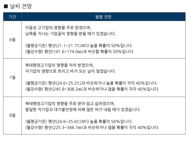 우리나라 부근에는 고기압성 순환이 강화되어 5월과 6월은 평년보다 기온이 높고 7월은 평년과 비슷할 것으로 예상되며, 강수량은 5월과 7월에는 평년과 비슷하거나 많고 6월은 평년과 비슷할 것으로 예측하고 있습니다.